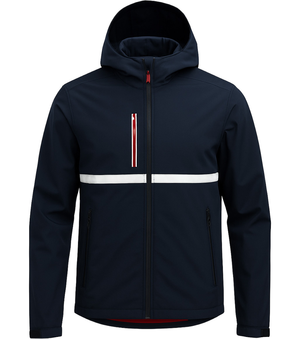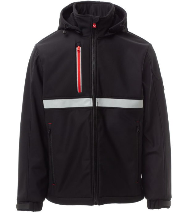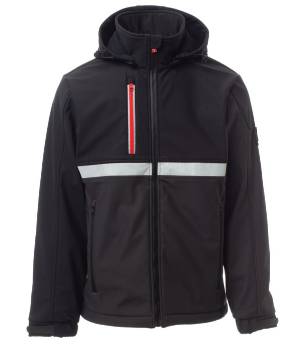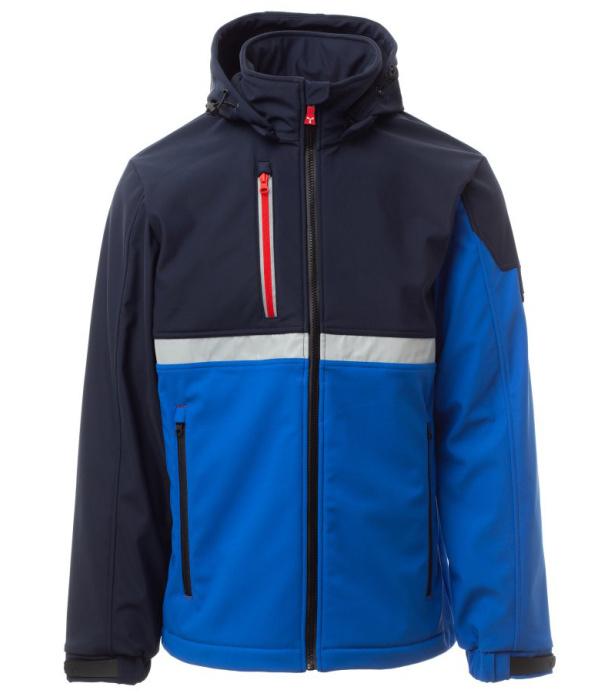 Pánská softshellová bunda z třívrstvého materiálu s vodním sloupcem WP 8000 mm H₂O a prodyšností WVT 5000 g/m²/24h. Dvoubarevné provedení se zapínáním na zip SBS s kovovým jezdcem „semi-auto lock“ a přizpůsobeným taháčkem. Odnímatelná kapuce se stahovací šňůrkou. Na hrudi je umístěna reflexní páska, na zádech speciální prvek „life-saving“ s reflexním logem a zapínáním na zip.