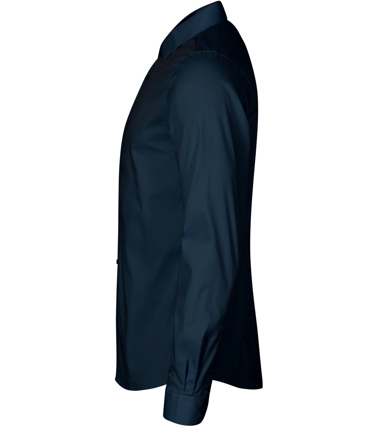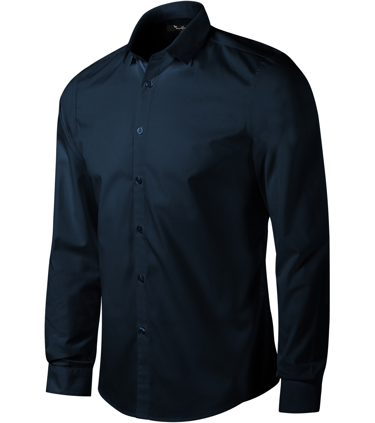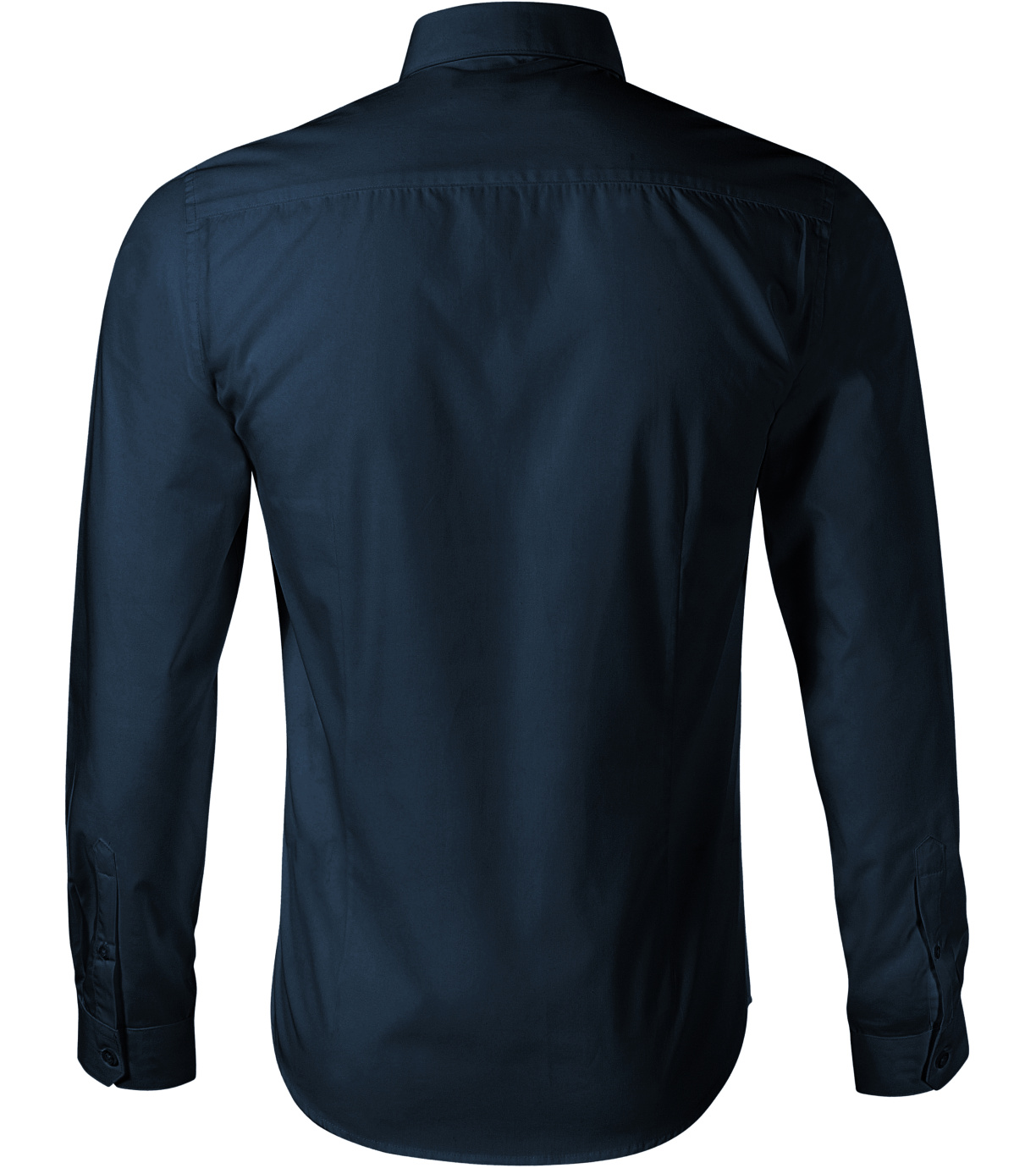 Pánská košile s dlouhými rukávy se šikmou manžetou na 1 knoflíček projmutého střihu s bočními švy vhodná pro výšivky a potisk má dvojité sedlo a záševky na zadním dílu, dvoudílný košilový límec, vyztužené špičky límců, přední kraje začištěny légou, perleťové knoflíčky v barvě materiálu (2 náhradní navíc) a tvarovaný dolní kraj.
