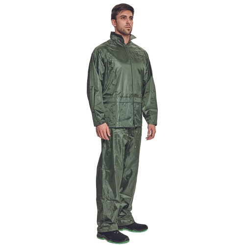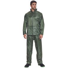 Dvoudílný voděodolný oblek s kapucí. ¾ plášť s integrovanou kapucí v límci a kalhoty v pase do gumy. Dvě přední široké kapsy kryté légami proti průniku vody. Spodní část rukávů lze regulovat drukem. Ventilace na zádech a v podpaží. Transportní obal.