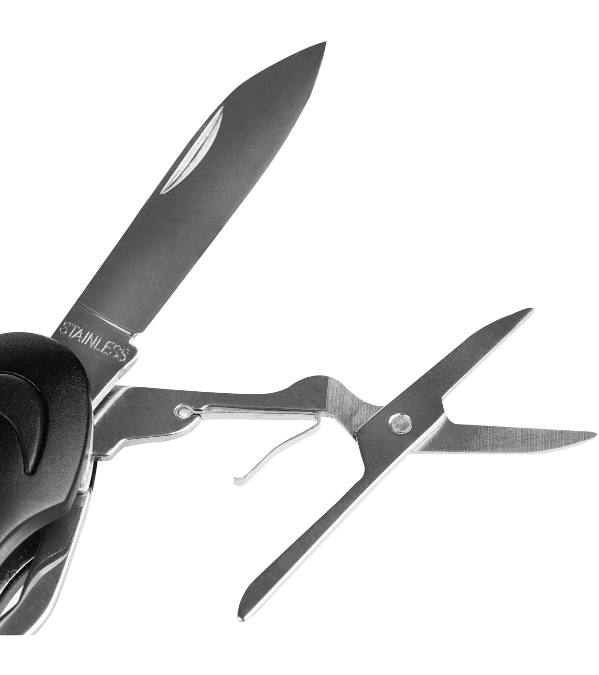 Nůž obsahuje: nůž, nůžky, otvírák na láhve, otvírák na konzervy, plochý šroubovák, Philips šroubovák, pilník na nehty, čistič nehtů, vývrtku, kroužek na klíče