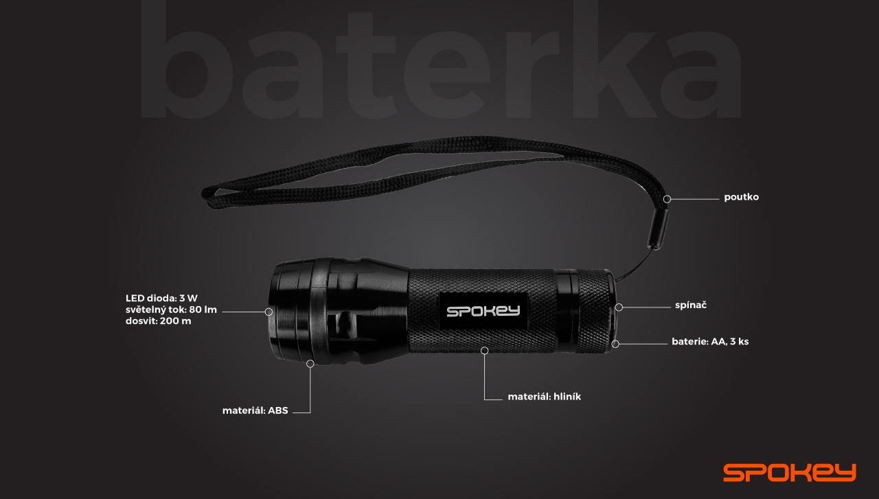 Baterka s poutkem: LED dioda: 3 W, světelný tok: 80 lm, dosvit: cca 200 m, baterie: 3x AAA (baterie nejsou součástí balení)