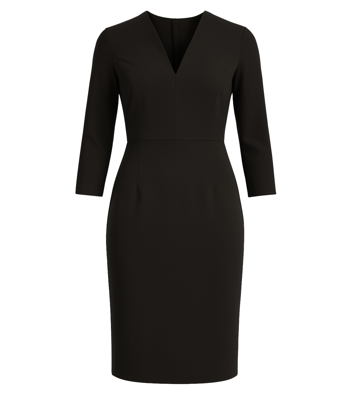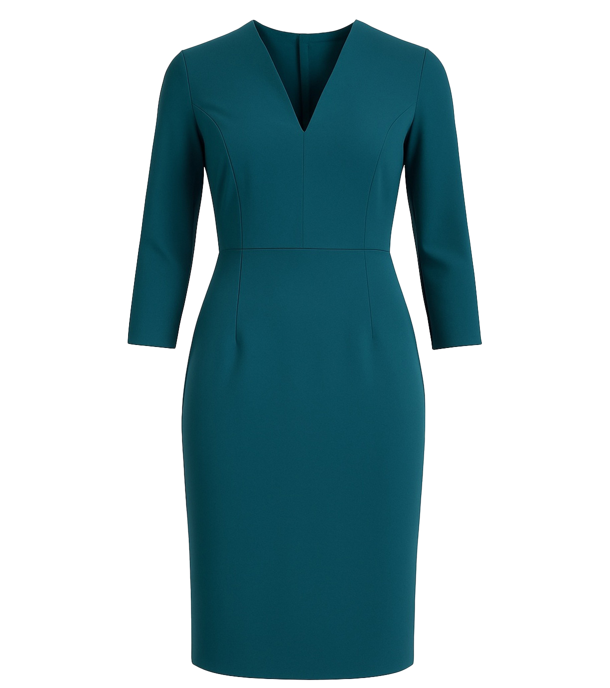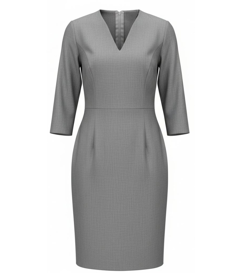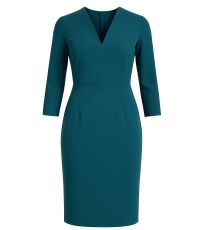 Dámské pouzdrové šaty s 3/4 rukávem jsou velmi jednoduchého designu s výstřihem do V. Rozparek na zadním díle, záševky vpředu i zezadu. Na zádech zapínání na zip. Šaty nemají podšívku.