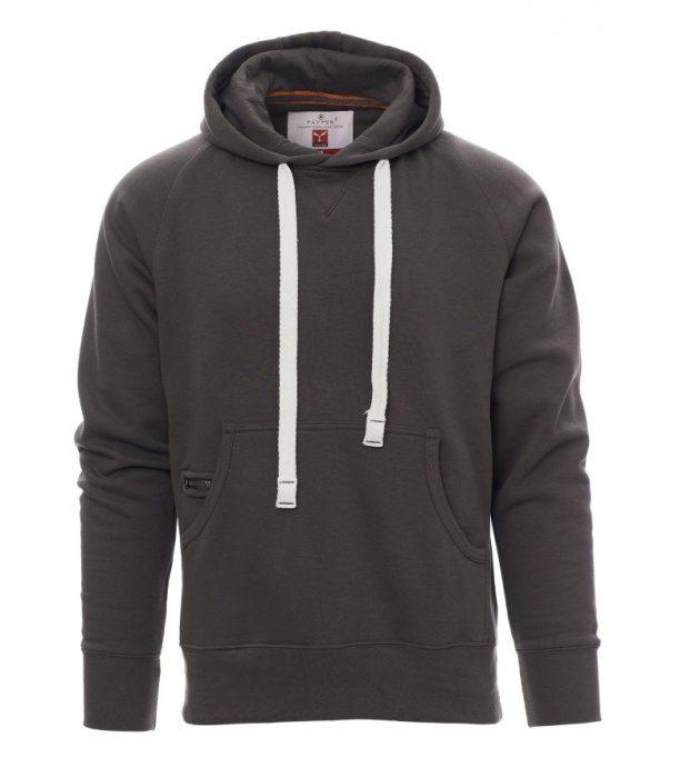 Pánská kapucová mikina s pevným dvojitým prošitím. Kapuce je doplněna bílou stahovací šňůrkou s kovovými kroužky a decentně sladěným prošitím. Má raglánové rukávy, dekorativní V-štep pod výstřihem a praktickou klokaní kapsu s malou kapsičkou na zip. Rukávy i spodní lem jsou zakončeny elastickým žebrováním. Pro vyšší odolnost jsou švy zesílené.