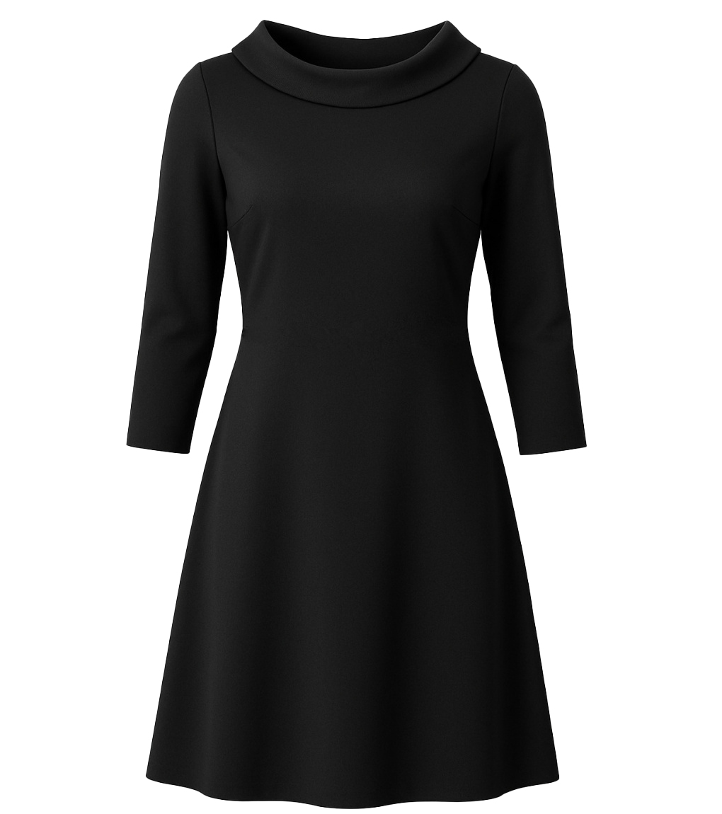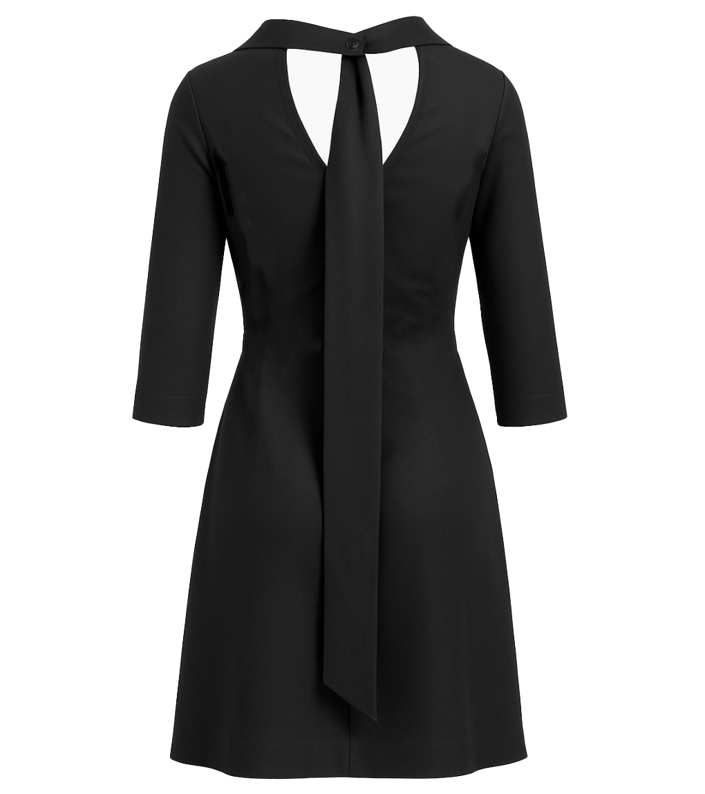 Dámské černé elegantní šaty s vázáním vzadu. Tyto nadčasové černé šaty působí elegantně a žensky díky jednoduchému, ale promyšlenému střihu. Mají jemně rozšířenou sukni do tvaru A a 3/4 rukávy, které dodávají celkovému vzhledu vyváženost. Výrazným prvkem je elegantní stojáček u výstřihu a dekorativní stuha vzadu, která vytváří decentní ozdobu a zároveň zajímavý detail zadního dílu. Malý výstřih na zádech dodává šatům moderní a sofistikovaný nádech.