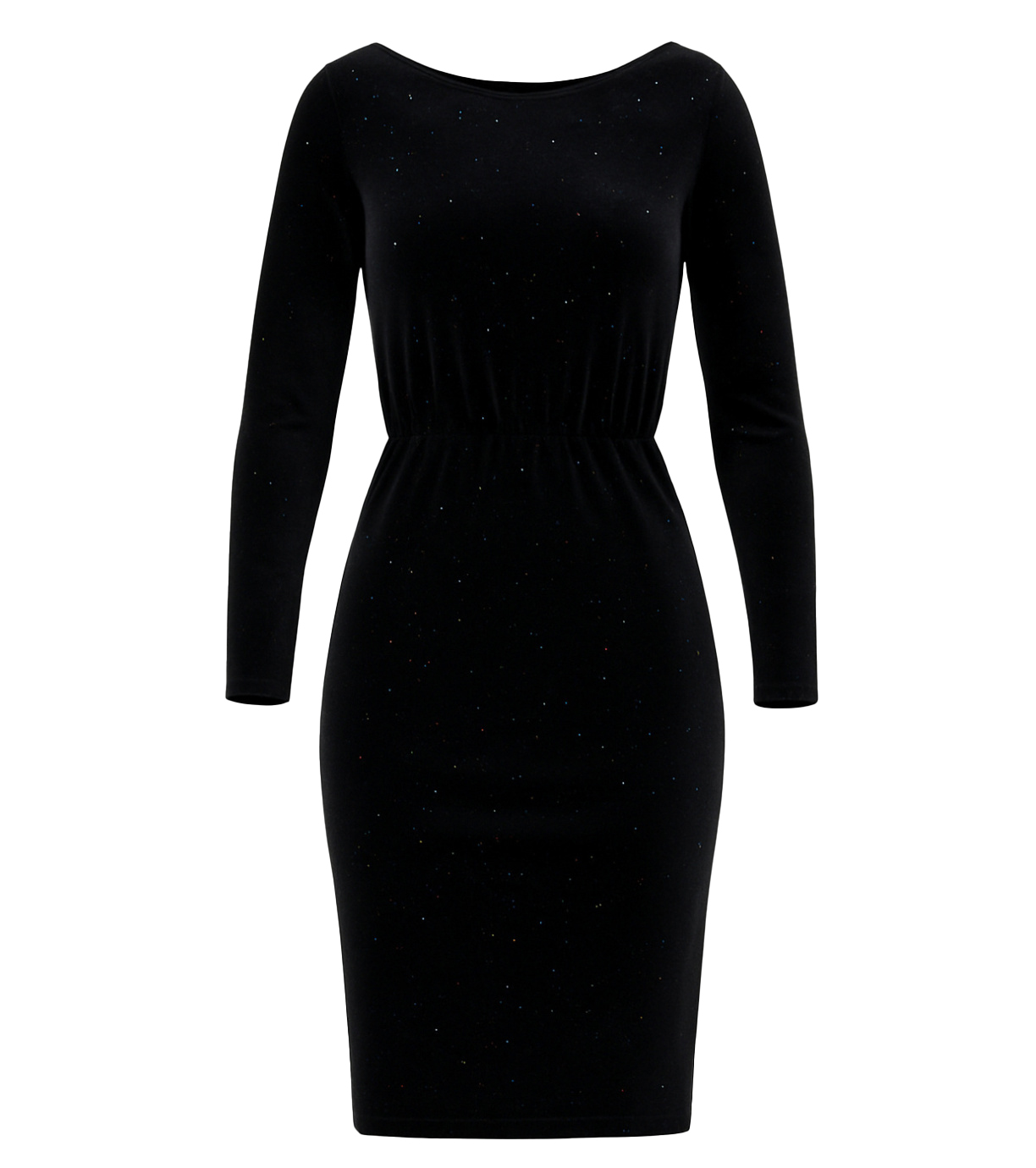 Dámské šaty s kulatým výstřihem a vykrojenými zády. V pase na gumu. Záševky v přední části. Šaty mají dlouhý rukáv a jsou zdobeny barevnými flitry.