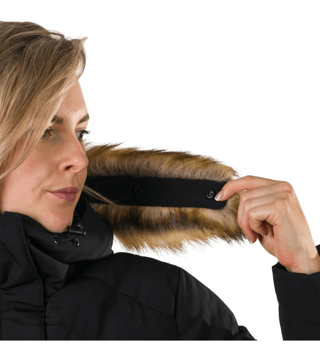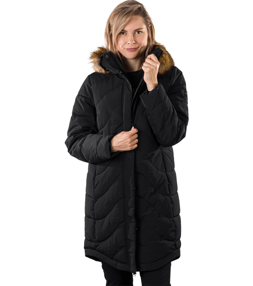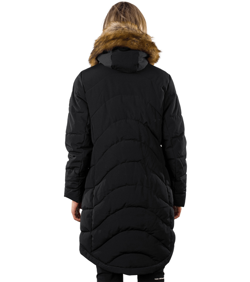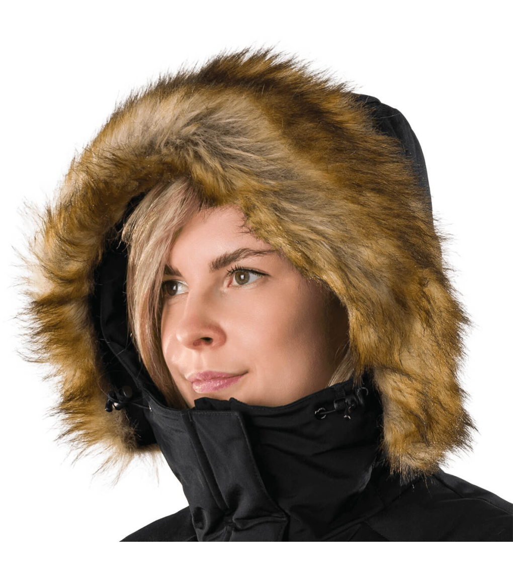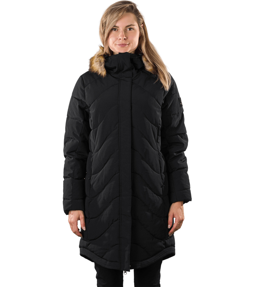 Dámská dlouhá bunda s odnímatelnou syntetickou kožešinou na kapuci je vhodná jak do města, tak i na hory. Díky kvalitnímu zateplení je bunda velmi teplá, vhodná i do tužších mrazů. Bunda je ošetřena kvalitní vodoodpudivou impregnací, která je zároveň ekologická a neobsahuje žádné PFC sloučeniny. Má dvě boční kapsy a malou skrytou kapsu na vnitřní straně. Střih je jemně tvarovaný v oblasti pasu s délkou těsně nad kolenami. Vysoký límec zabraňuje nepříjemnému profouknutí a přední klopa bundy chrání před větrem.