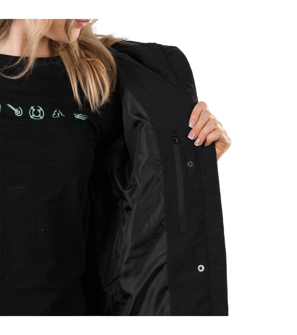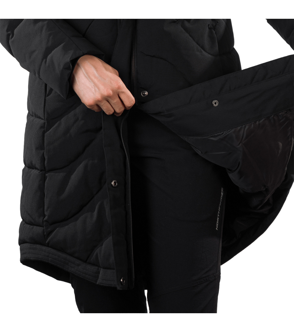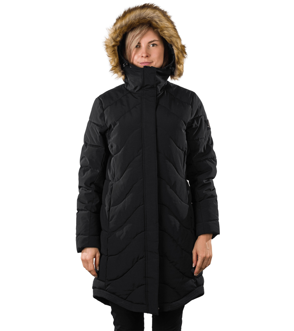 Dámská dlouhá bunda s odnímatelnou syntetickou kožešinou na kapuci je vhodná jak do města, tak i na hory. Díky kvalitnímu zateplení je bunda velmi teplá, vhodná i do tužších mrazů. Bunda je ošetřena kvalitní vodoodpudivou impregnací, která je zároveň ekologická a neobsahuje žádné PFC sloučeniny. Má dvě boční kapsy a malou skrytou kapsu na vnitřní straně. Střih je jemně tvarovaný v oblasti pasu s délkou těsně nad kolenami. Vysoký límec zabraňuje nepříjemnému profouknutí a přední klopa bundy chrání před větrem.