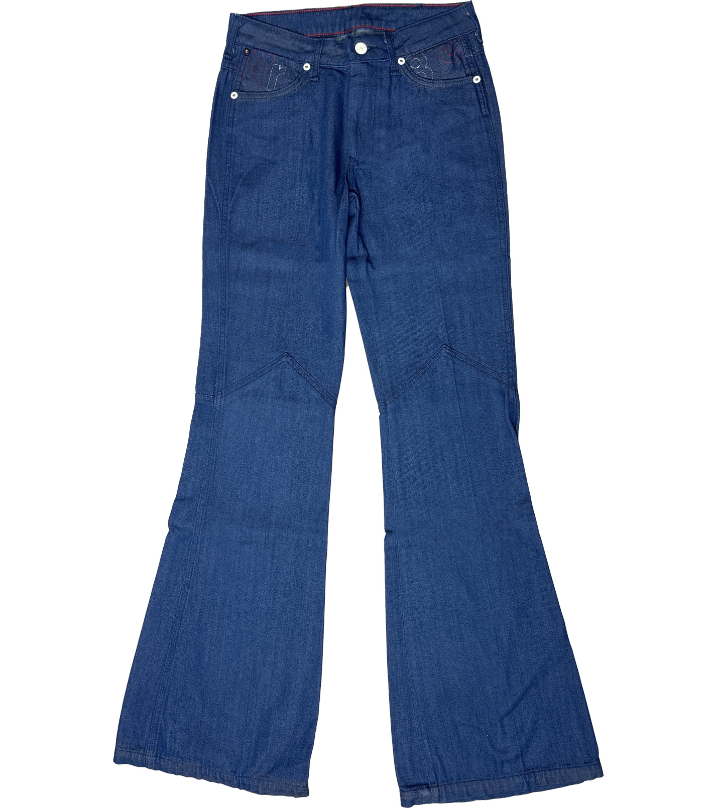 Dámské džíny v klasickém modrém odstínu s výrazným flare střihem (rozšířené nohavice), který dodává outfitu retro vzhled inspirovaný 70. lety. Přiléhavý střih v oblasti boků a stehen zvýrazňuje siluetu, zatímco rozšíření od kolen opticky prodlužuje nohy. Kvalitní denim je pevný, odolný a zároveň pohodlný pro celodenní nošení. Džíny mají zapínání na knoflík a zip, poutka na pásek a klasické pětikapsové provedení. Decentní detaily a čistý design umožňují snadné kombinování s halenkami, topy i svetříky. Ideální volba pro módní městský styl i výrazné každodenní outfity.