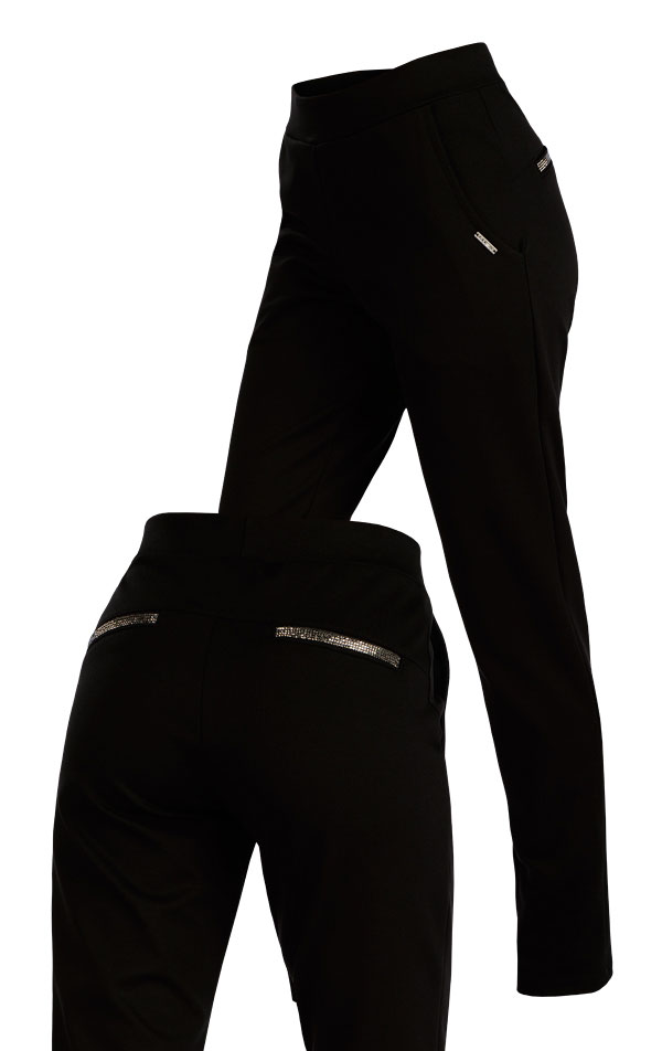 Elegantní styl s vyšším sedem a elastickým pasem s bočními kapsami. Na zadním díle ozdobné falešné kapsy z aplikace kamínků. Silnější elastický úplet perfektně drží tvar a je příjemný na nošení. Velmi praktický kombinovatelný kousek.