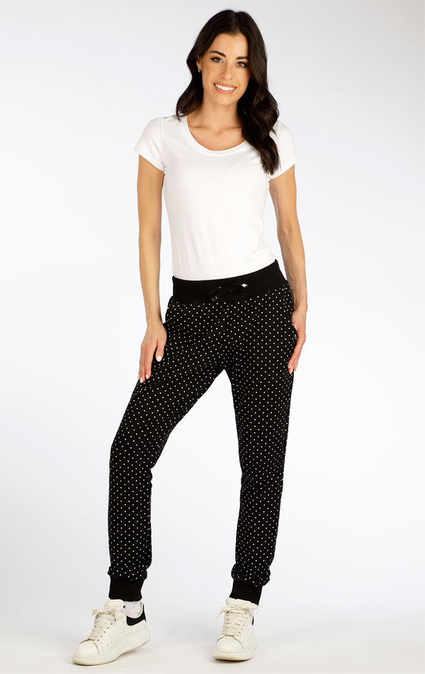 V pase pružný žebrový lem s gumou a s tkanicí na stažení. Praktické kapsy. Nohavice do žebrového nápletu. Vysoký obsah bavlny v kombinaci s elastanem zaručuje prodyšnost, tvarovou stálost a příjemný pocit při nošení. Velmi pohodlný, pružný bavlněný úplet.