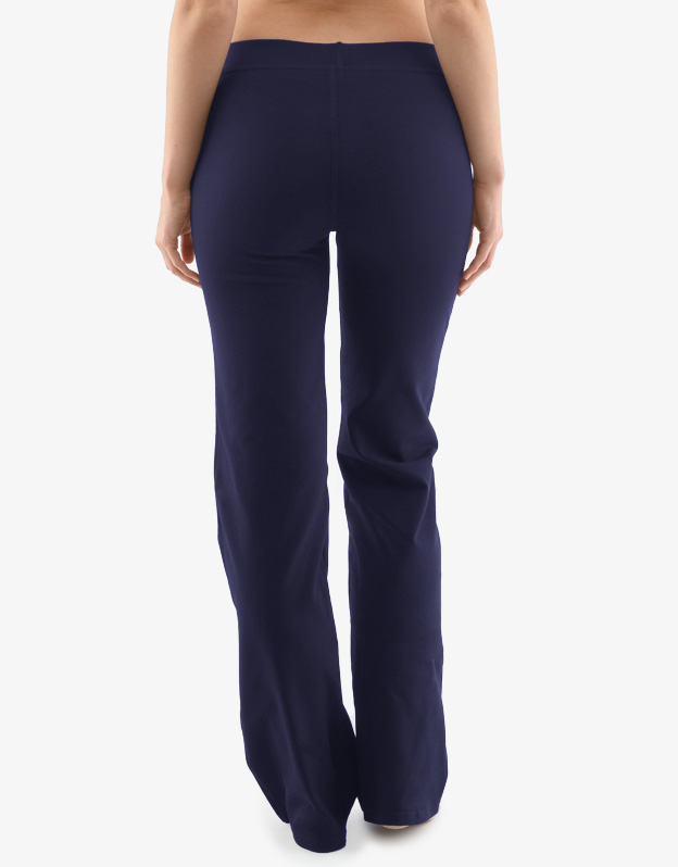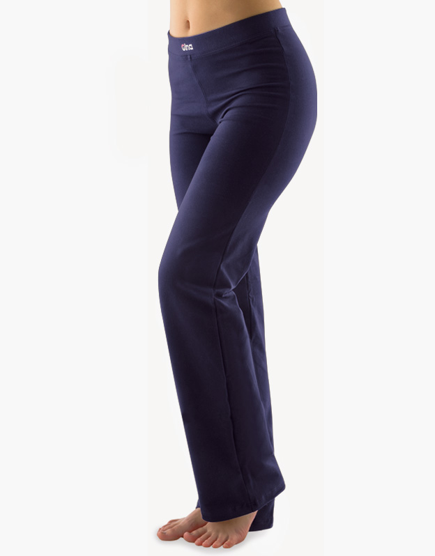 Rovné dlouhé kalhoty v základní délce, dámské šité sportovní prádlo. V pasovém kraji je zašitá širší pruženka. Legíny jsou jednobarevné. Na pasovém kraji je umístěné logo.