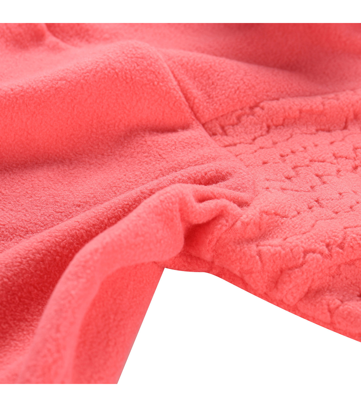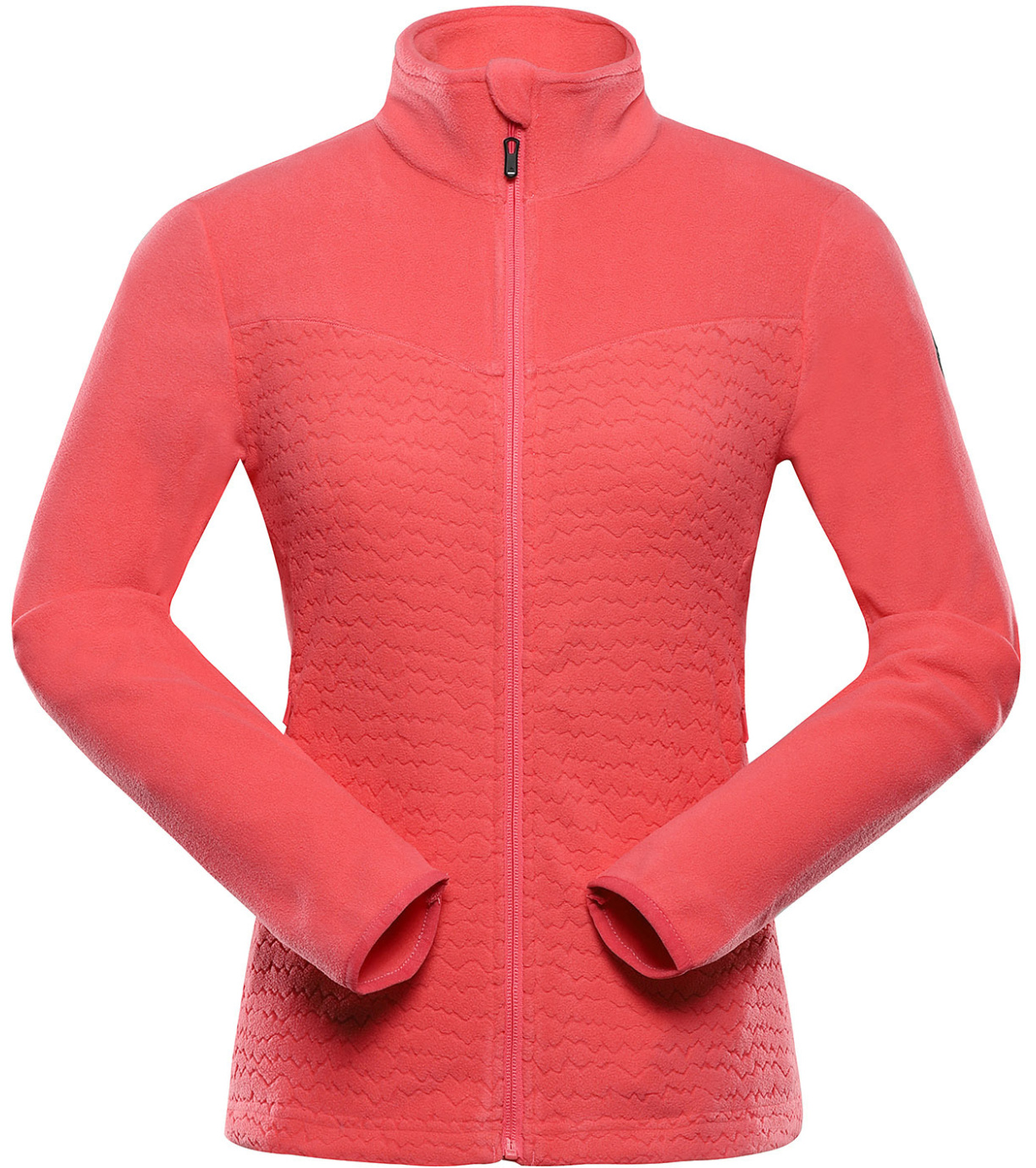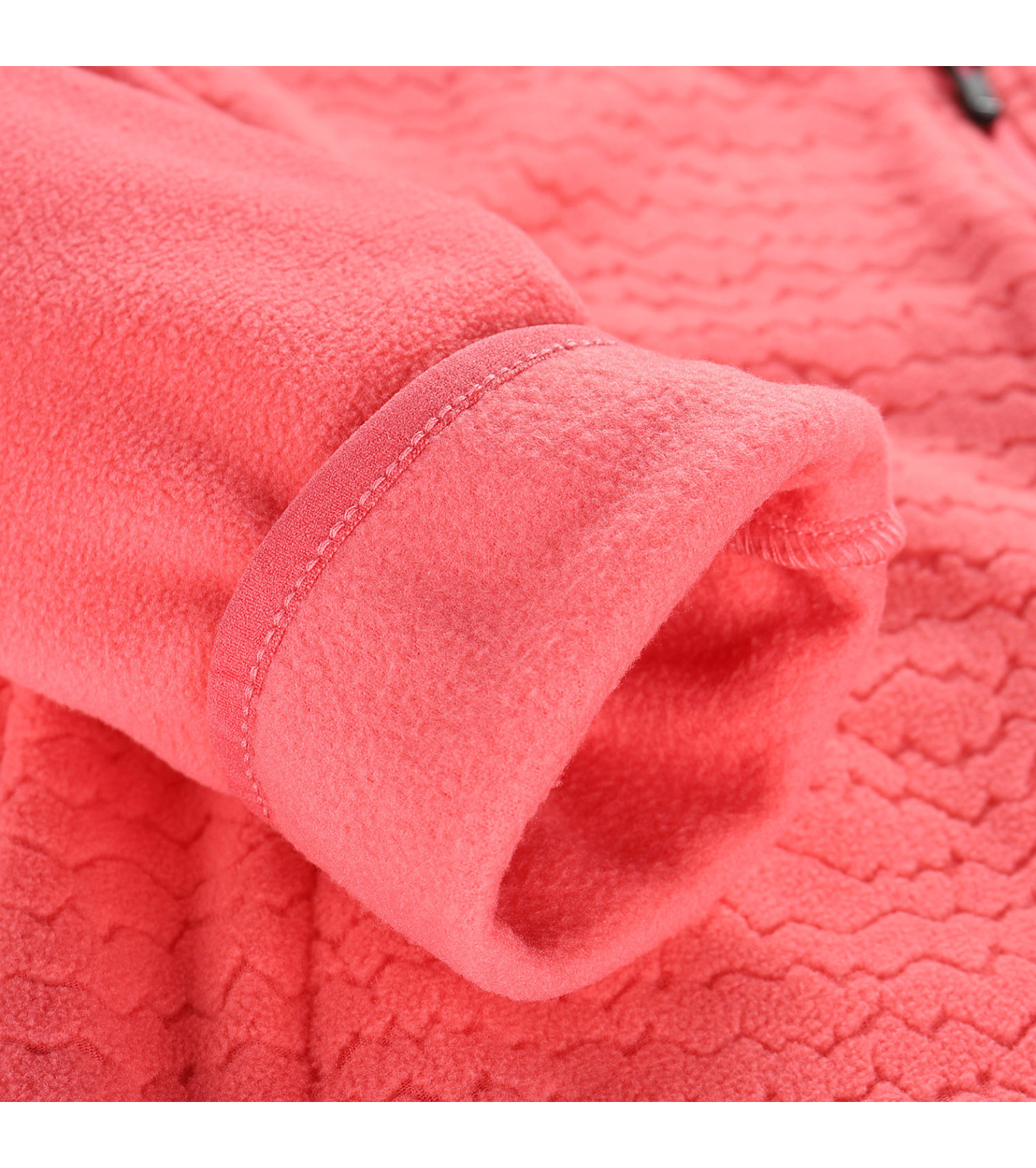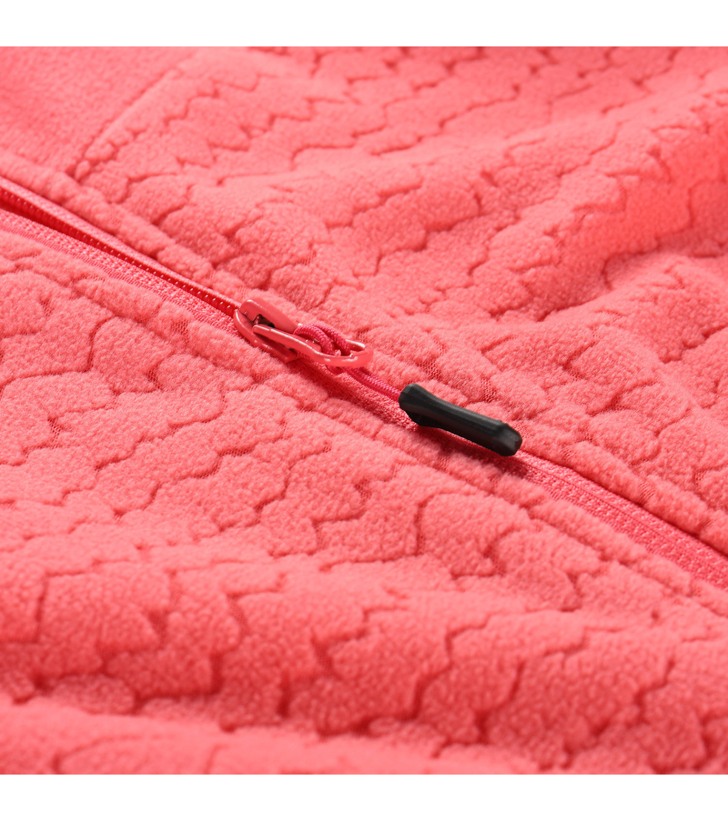 Dámská fleecová mikina je vyrobena ze 100% polyesteru v provedení microfleece, který je hřejivý, paropropustný a pružný, takže poskytuje vysoký komfort při nošení. Embosovaný materiál dodává mikině moderní vzhled a zároveň zvyšuje její atraktivitu. Polopřiléhavý střih lichotí postavě a neomezuje v pohybu. Praktický vysoký límec s krytkou u brady chrání před chladem, rukávy zakončené gumovým lemem dobře drží tvar a brání tepelným ztrátám.