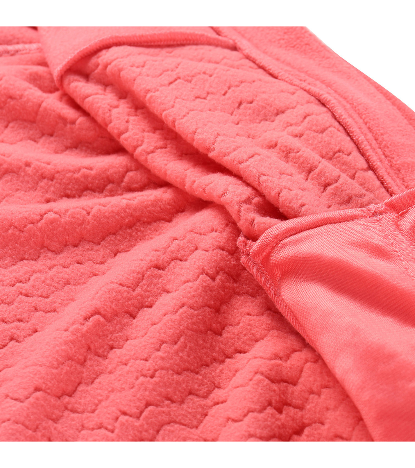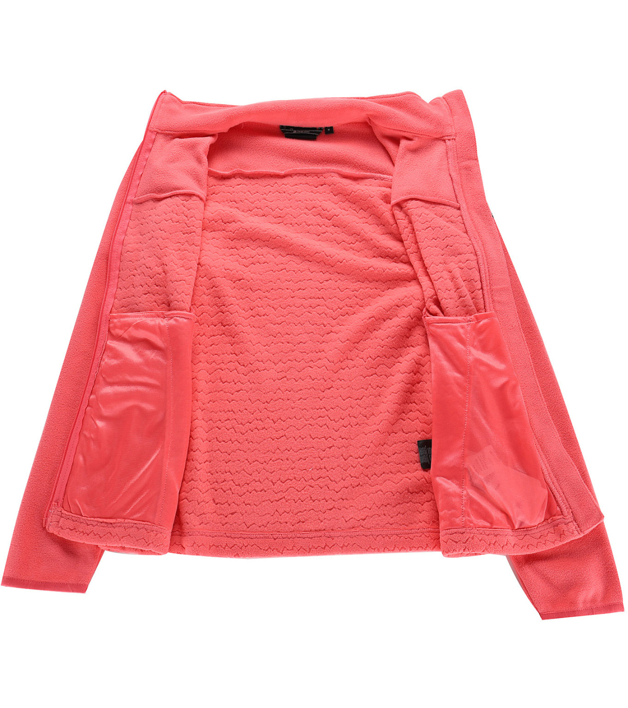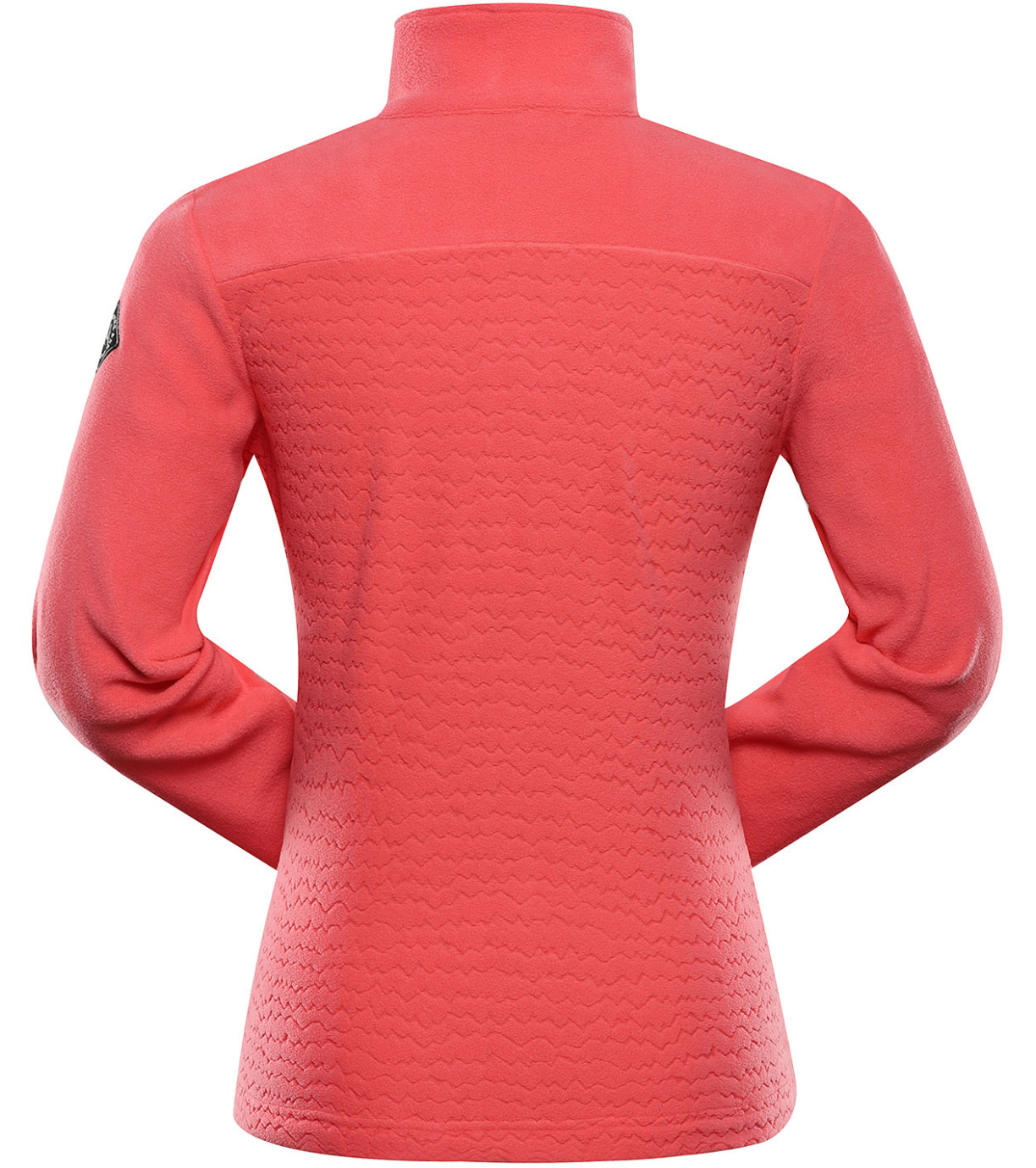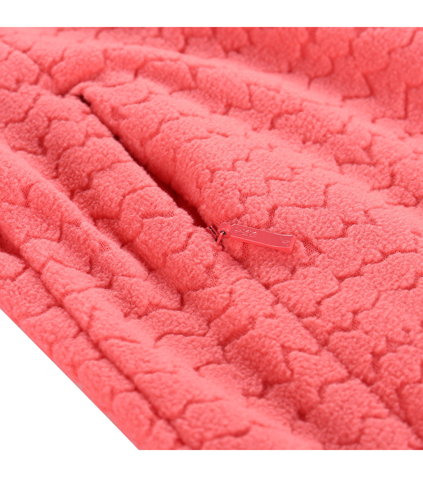 Dámská fleecová mikina je vyrobena ze 100% polyesteru v provedení microfleece, který je hřejivý, paropropustný a pružný, takže poskytuje vysoký komfort při nošení. Embosovaný materiál dodává mikině moderní vzhled a zároveň zvyšuje její atraktivitu. Polopřiléhavý střih lichotí postavě a neomezuje v pohybu. Praktický vysoký límec s krytkou u brady chrání před chladem, rukávy zakončené gumovým lemem dobře drží tvar a brání tepelným ztrátám.