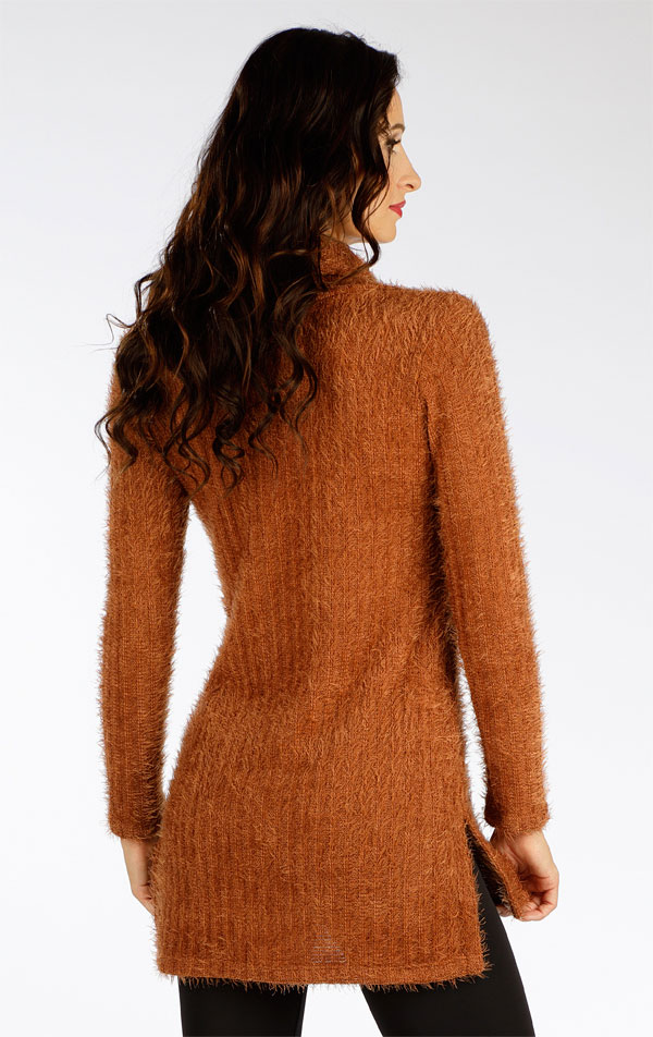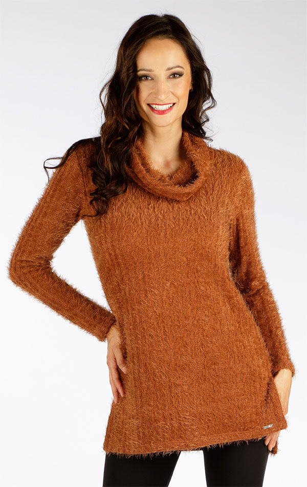 Vysoký spadlý límec. Delší zadní díl. Rozparky na bocích. Originální vzhled pleteniny s plastickým vzorem a hebkým, příjemným omakem.