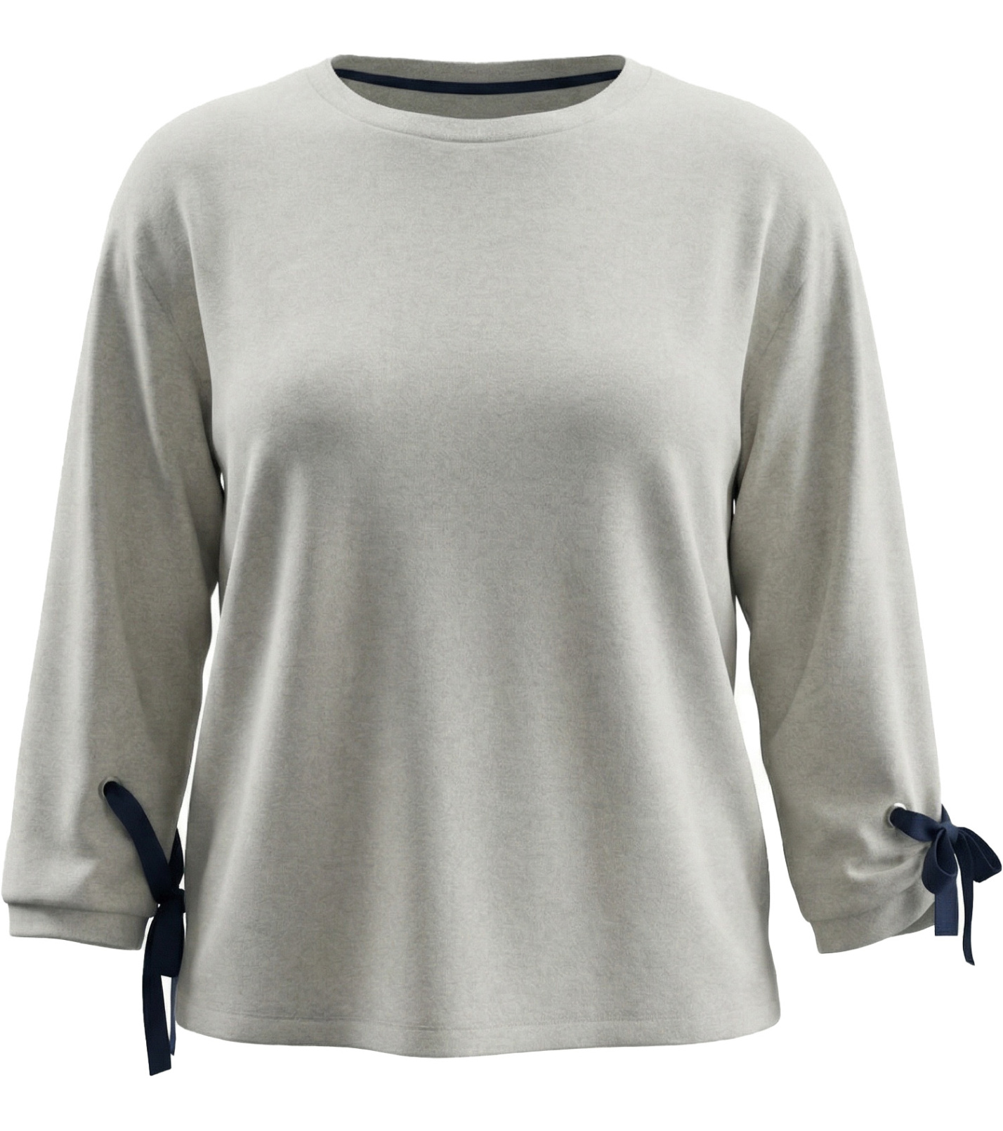 Dámský svetr přes hlavu je volnějšího střihu. Zadní díl je mírně prodloužený. Rukávy jsou zdobeny šňůrkou, kterou lze rukávy stáhnout.