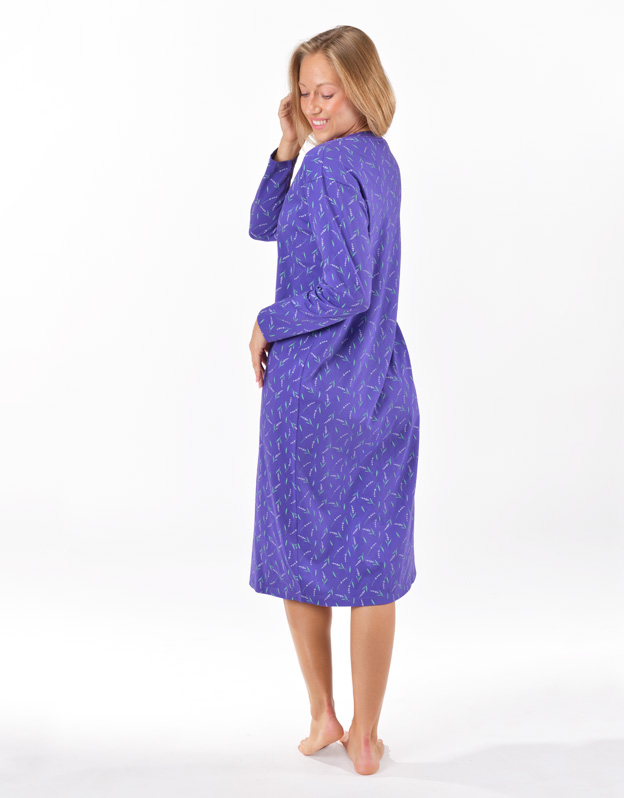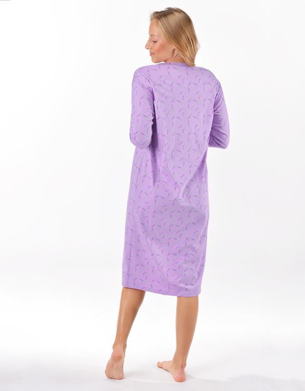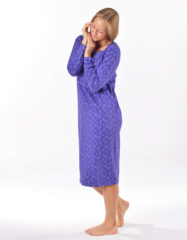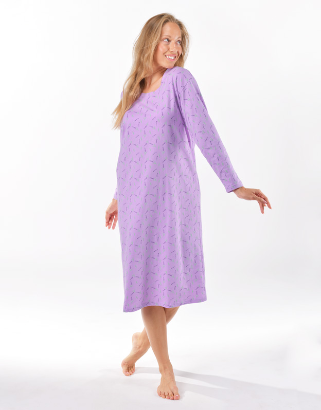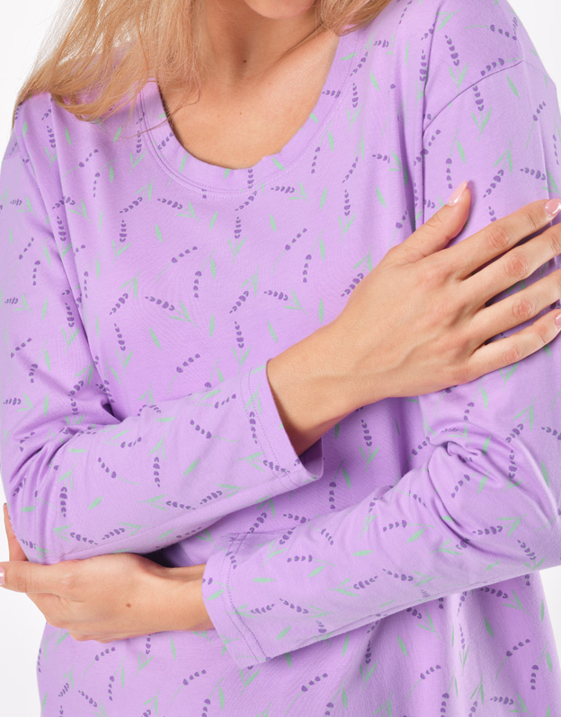 Základem kvalitního spánku je vaše pohodlí, ke kterému vám pomůže i pohodlné noční prádlo. Naše dámská noční košilka s dlouhým rukávem je ideální volbou pro každou milovnici volných střihů a kvalitních materiálů. Noční košilka je dlouhá, zdobí ji potisk s levandulemi, nikde neškrtí. Materiál ze 100% bavlny vám zajistí pohodlí po celou noc.