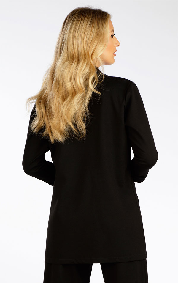 Ležérní styl s 3/4 rukávy a ohrnutou manžetou. Sako má fazónový límec a praktické kapsy našité na předních dílech. Volnější střih bez zapínání. Silnější elastický úplet perfektně drží tvar a je příjemný na nošení. Velmi praktický kombinovatelný kousek.