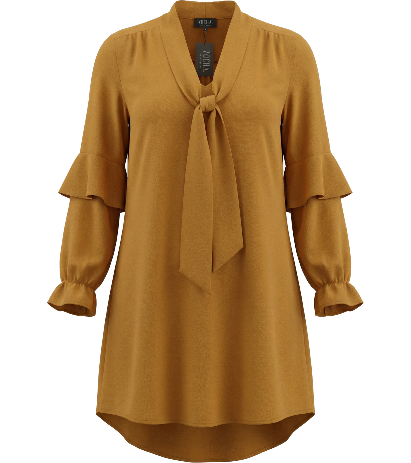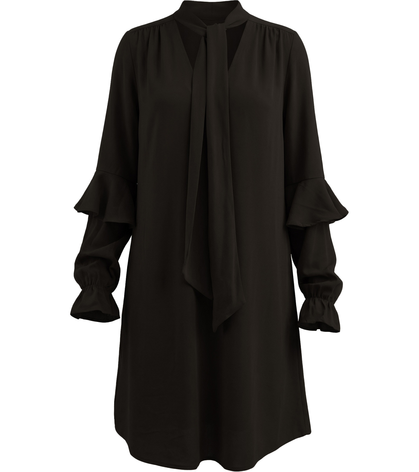 Dámské letní šaty jsou vyrobené z lehkého viskózového materiálu. Rukávy jsou zdobené jemnými volány. Límeček přechází do mašle, možno zavázat také na uzel a nechat volně viset.