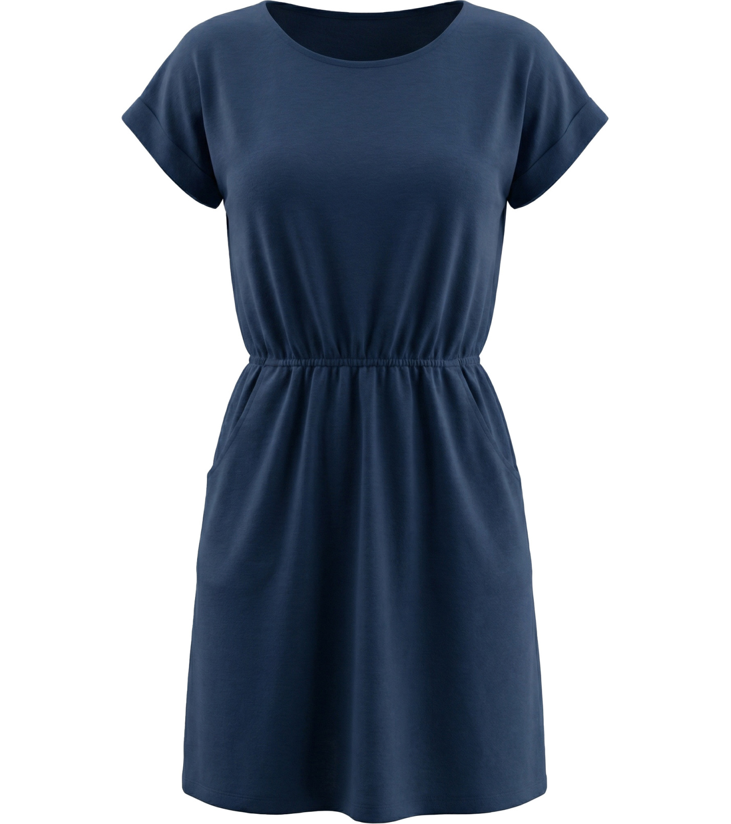 Pohodlné dámské šaty v elegantní tmavě modré barvě s jednoduchým a nadčasovým designem. Krátké rukávy a kulatý výstřih dodávají šatům ležérní vzhled, zatímco pružný pas se stahováním jemně zvýrazňuje siluetu a zajišťuje pohodlné nošení. Měkký, splývavý materiál je příjemný na dotek a vhodný pro celodenní využití. Praktické boční kapsy zvyšují funkčnost. Ideální volba pro každodenní nošení, do města i na neformální společenské příležitosti.