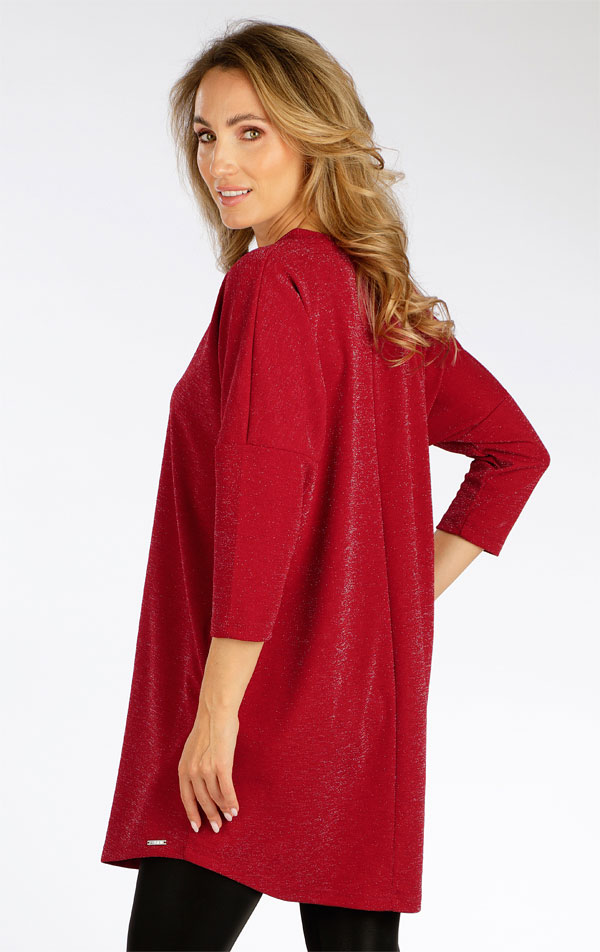 Volný střih s výstřihem do V. Tvarovaná délka a praktické boční kapsy. Elegantní úplet se stříbrným vláknem je pružný a tvarově stálý. Tunika je vhodná nejen na běžné nošení, ale i k slavnostní příležitosti.