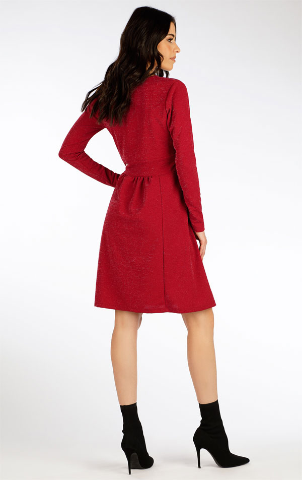 Elegantní dámské šaty s hlubokým výstřihem a tvarovaným pružným páskem pod prsy pro zvýraznění ženské siluety. Spodní díl šatů nařasený pro pohodlné nošení. Elegantní úplet se stříbrným vláknem je pružný a tvarově stálý. Je vhodný nejen na běžné nošení, ale i k slavnostní příležitosti.
