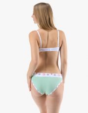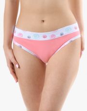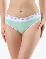 Bokové kalhotky se širším bokem a se širším pasovým lemem, dámské šité prádlo. Pasový kraj je začištěný širším lemem ze stejného materiálu. Nohavičky jsou začištěné úzkým lemem ze stejného materiálu. Lemy v pase a v nohavičkách jsou potištěné. Přední a zadní díl je jednobarevný.