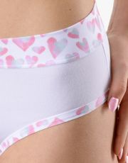 Bokové kalhotky se širším bokem a se širším pasovým lemem, dámské šité prádlo. Pasový kraj je začištěný širším lemem ze stejného materiálu. Nohavičky jsou začištěné úzkým lemem ze stejného materiálu. Lemy v pase a v nohavičkách jsou potištěné. Přední a zadní díl je jednobarevný.