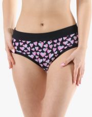 Kalhotky klasického střihu se širším pasovým lemem, dámské šité prádlo. Pasový kraj je začištěný širším lemem ze stejného materiálu. Nohavičky jsou začištěné úzkým lemem ze stejného materiálu. Přední díl je potištěný. Zadní díl a lemy jsou jednobarevné.