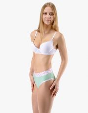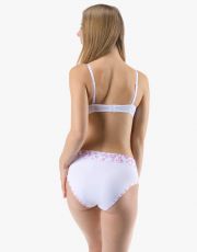 Kalhotky klasického střihu se širším pasovým lemem, dámské šité prádlo. Pasový kraj je začištěný širším lemem ze stejného materiálu. Nohavičky jsou začištěné úzkým lemem ze stejného materiálu. Přední díl je jednobarevný, lemy v pase a v nohavičkách jsou potištěné.