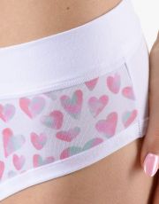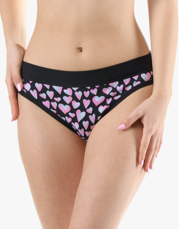 Kalhotky klasického střihu s úzkým bokem a širším pasovým lemem, dámské šité prádlo. Pasový kraj je začištěný širším lemem ze stejného materiálu. Nohavičky jsou začištěné úzkým lemem ze stejného materiálu. Přední díl je potištěný. Zadní díl a lemy jsou jednobarevné.