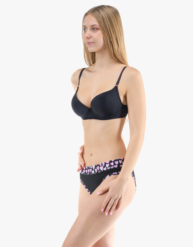 Kalhotky klasického střihu s úzkým bokem a širším pasovým lemem, dámské šité prádlo. Pasový kraj je začištěný širším lemem ze stejného materiálu. Nohavičky jsou začištěné úzkým lemem ze stejného materiálu. Přední díl je jednobarevný, lemy v pase a v nohavičkách jsou potištěné.